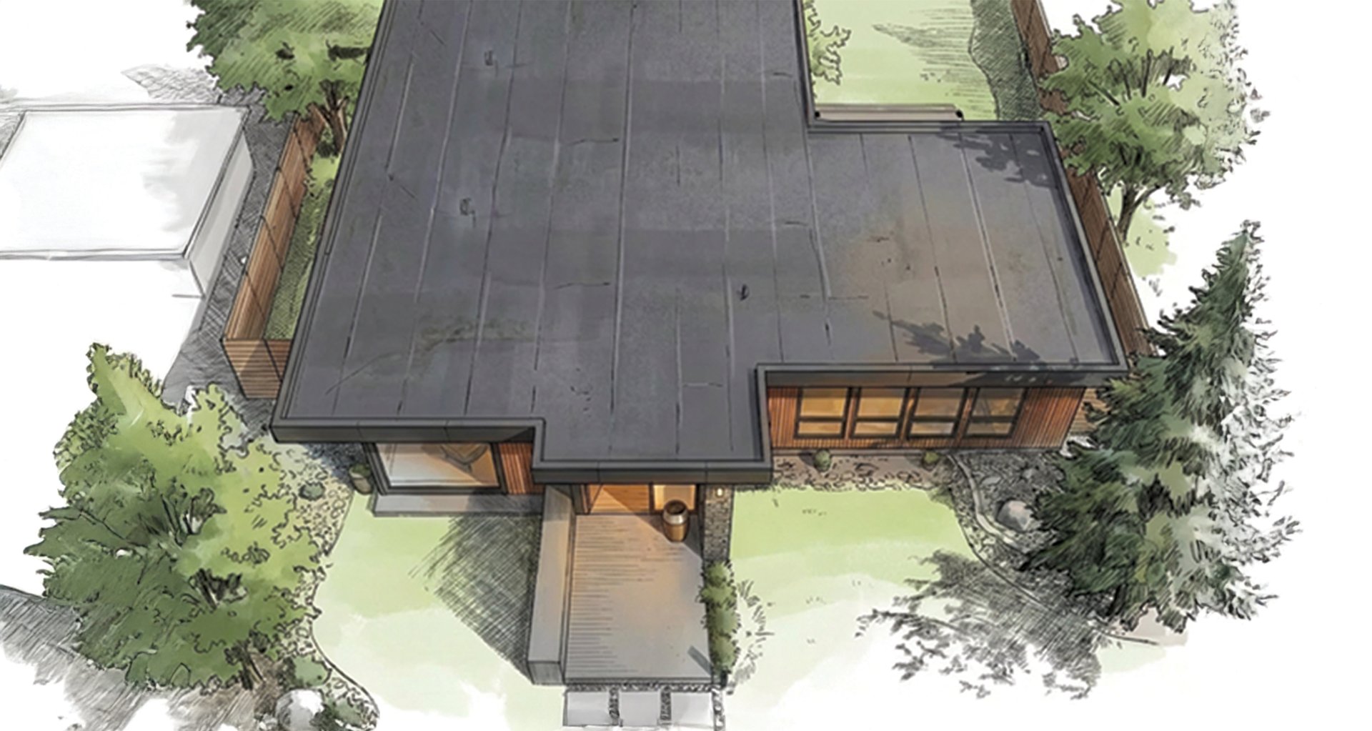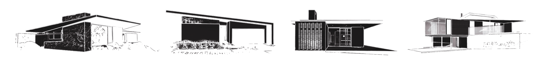 • Low-slope modern rooflines that create a bold horizontal profile