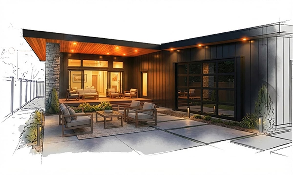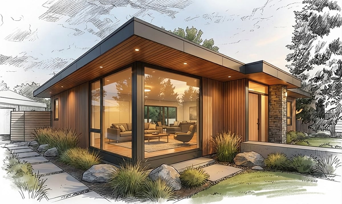 Concept rendering of a modern bungalow renovation exploring how traditional homes in Lethbridge can be transformed through contemporary architecture, natural materials, and expanded glass openings.